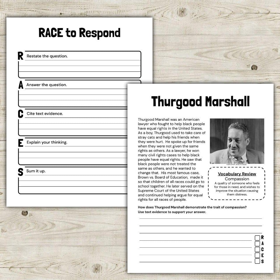 • A short reading passage covering Thurgood Marshall’s life, accomplishments, and legacy.